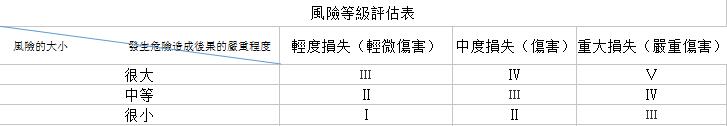 表中:Ⅰ—可忽略風險,Ⅱ—可容許風險,Ⅲ—中度風險,Ⅳ—重大風險,Ⅴ—不容許風險。