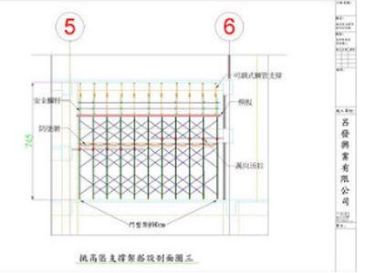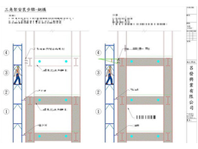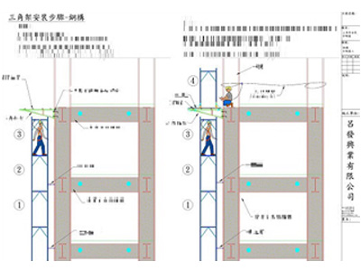 3.剖面鷹架配置圖(含三角架、斜籬;有垂直母索的拆架施工階段拆除步驟圖)